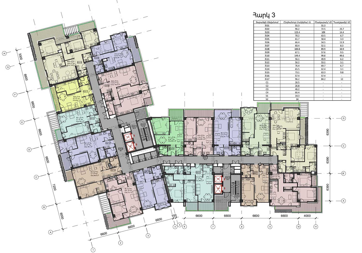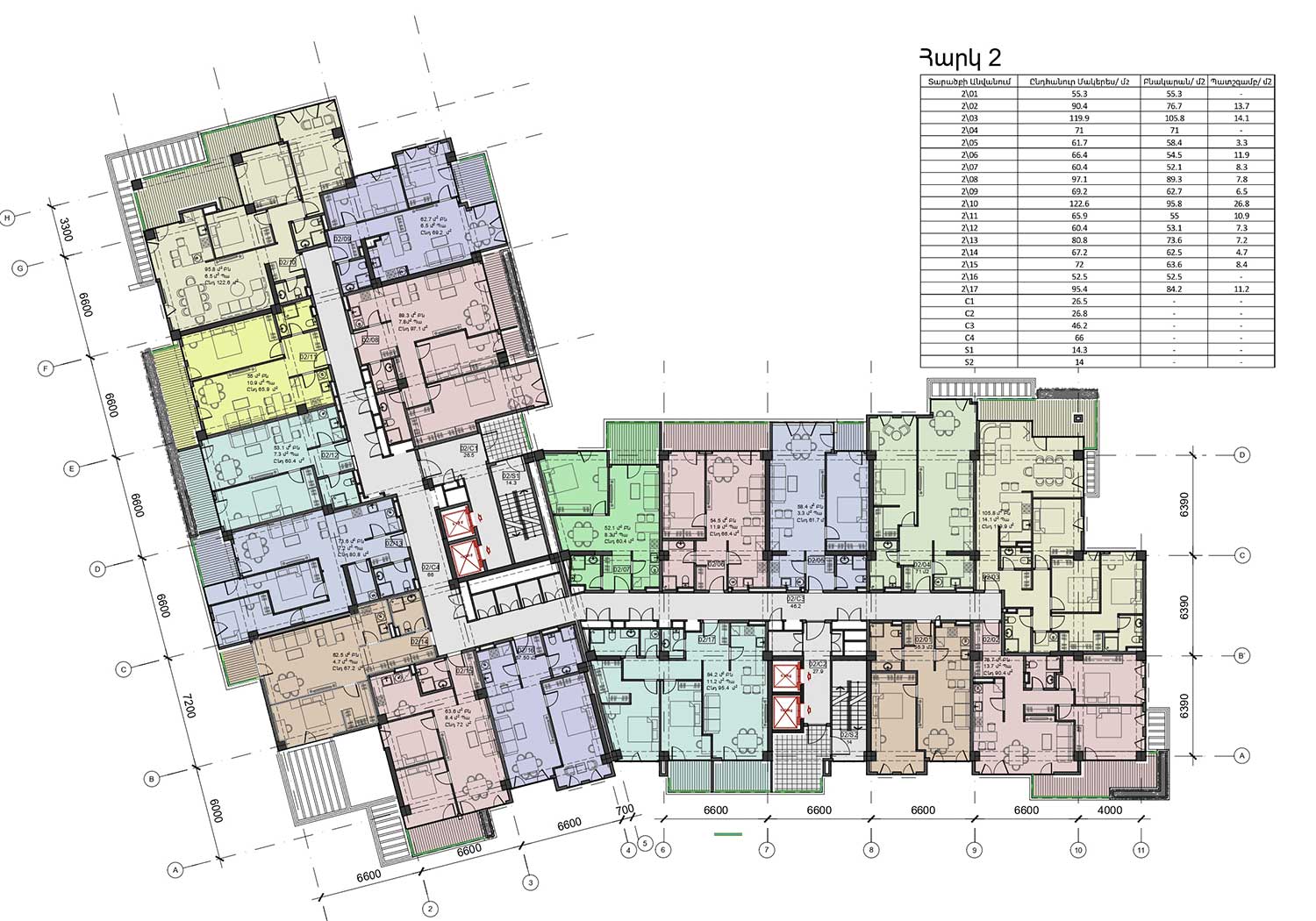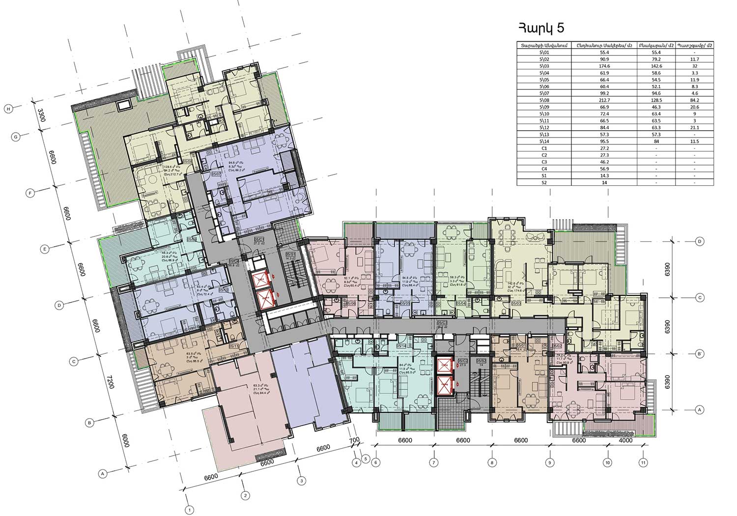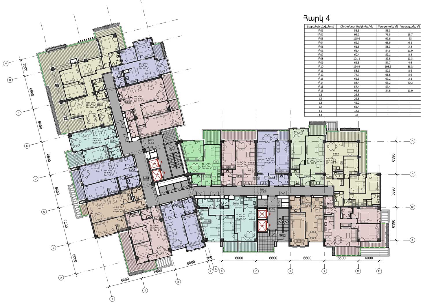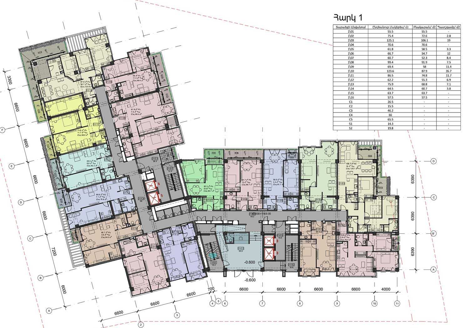 Շենքում առկա են 2-4 սենյականոց բնակարաններ՝ 55-212 քմ մակերեսներով