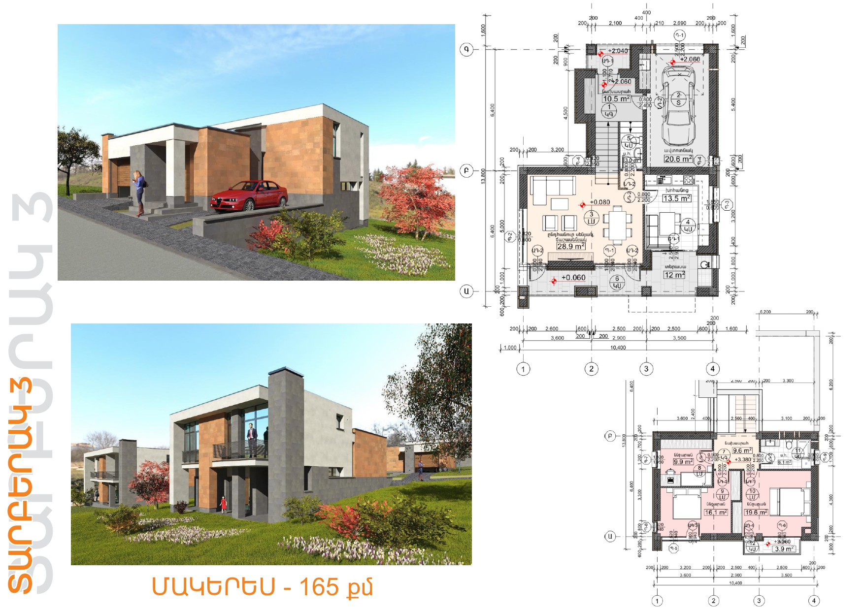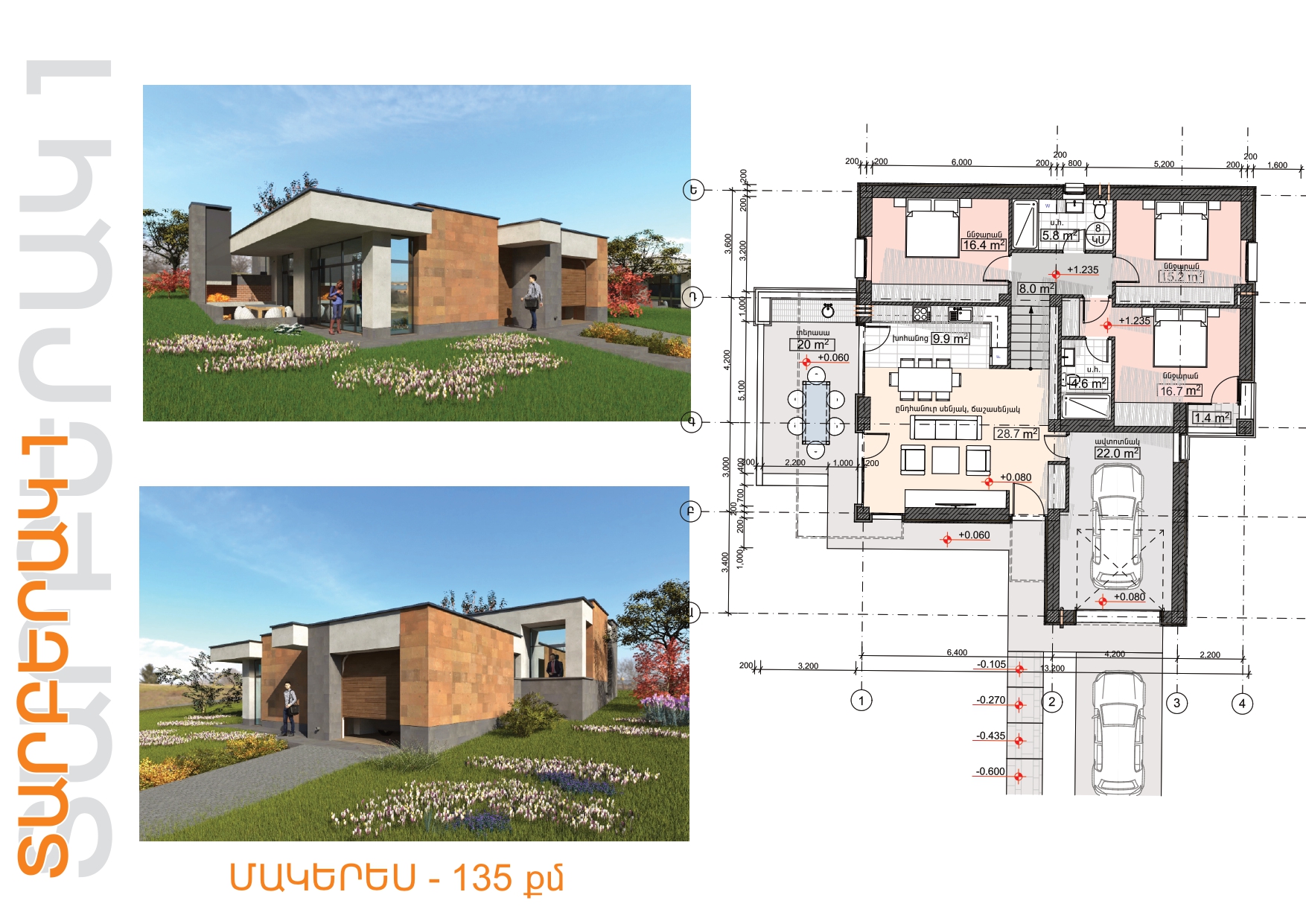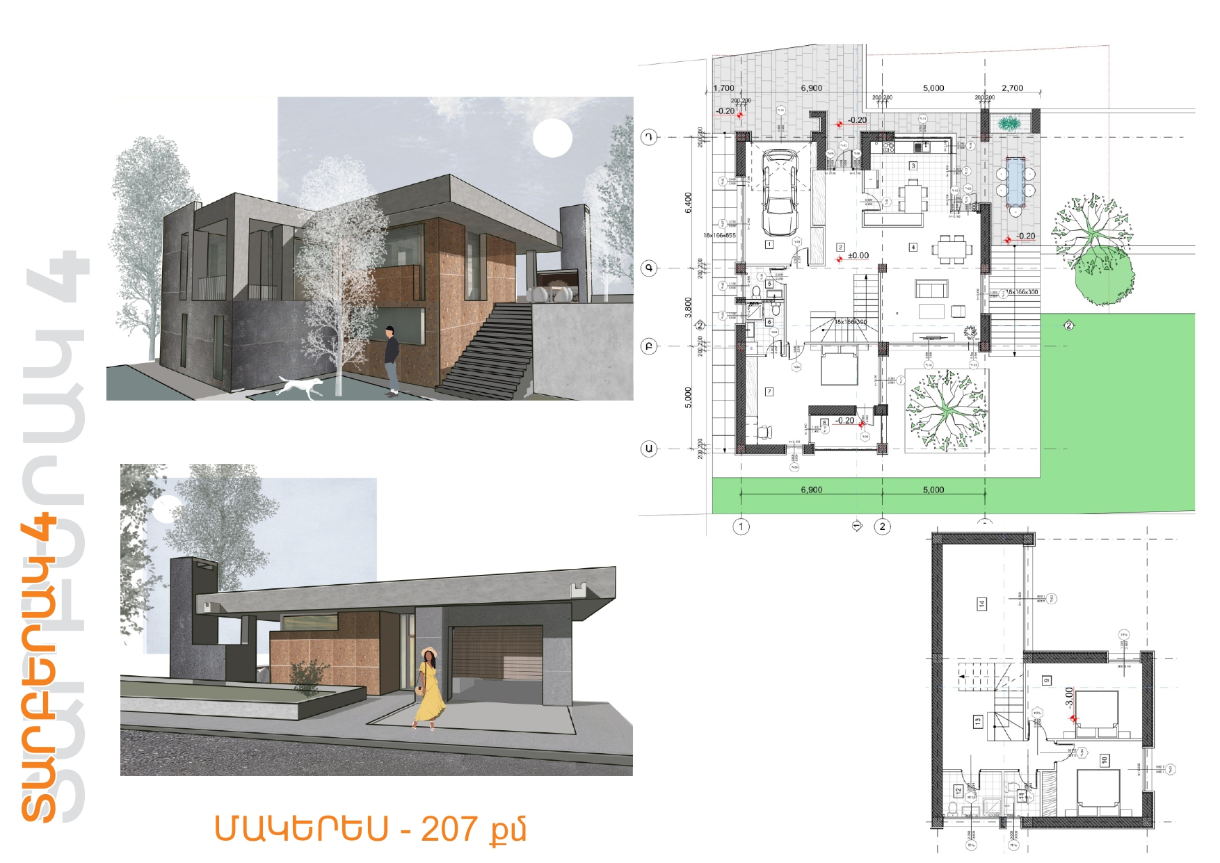 Ձեր ընտրությանն ենք ներկայացնում 130-200քմ ընդանուր մակերեսով, 490 քմ և ավելի հողամասերով և կանաչապատ բակերով առանձնատների 5 տիպային նախագիծ։ Ժամանակակից, էրգոնոմիկ լուծումներով միահարկ և երկհարկանի առանձնատների նախագծերը գրավիչ են իրենց ճարտարապետական հորինվածքով և բնակելի սենյակների դասավորությամբ, որտեղ լայն պատուհաններից ներս է թափանցում շրջակա բնությունը: Պարզ նրբագեղությանը տիրույթը, կարծես, լույս և մաքուր օդ է կլանում, այն ազատ է «տեսողականը աղմուկից»։ Արտաքին և ներքին հարդարման համար ընտրված է զուսպ ներկապնակը, առավելագույնը՝ երկու-երեք գույն, որոնք ձեր ցանկությամբ կհամադրվեն որևէ վառ գույնով՝ միջավայրը դարձնելով տարբերվող և առավել հոգեհարազատ: